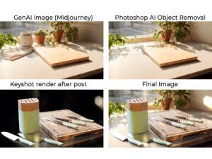 To keep things fresh and efficient, I’ve pioneered a hybrid workflow for lifestyle images. I take my high-fidelity 3D renders and place them into stunning, ‘aspirational’ kitchen environments built with GenAI. This allows me to create infinite lifestyle looks in a fraction of the time it would take for a traditional photo shoot, giving a brand massive flexibility for social media and web content.